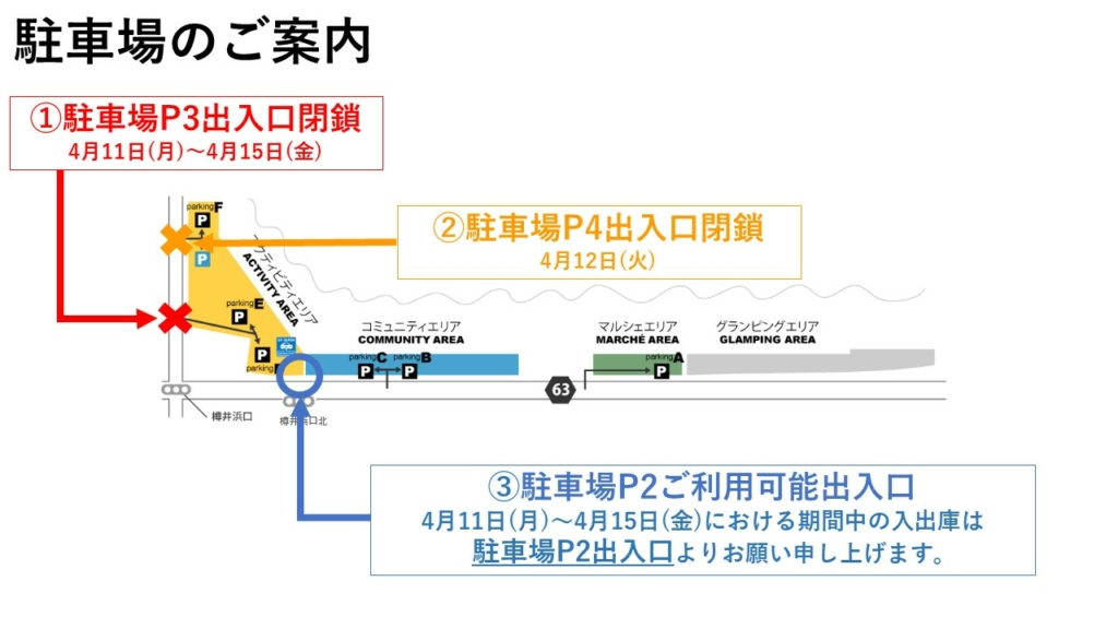 ①駐車場P3出入口閉鎖:4月11日(月)~4月15日(金)まで駐車場P3出入口を閉鎖致します。