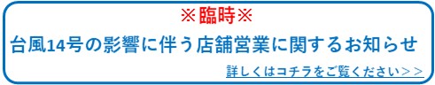 台風14号の接近に伴う店舗営業に関するお知らせ 2022 9/19 お知らせ 2022/09/19 台風14号の接近に伴い、一部店舗の臨時休業および営業時間短縮をさせて頂いている店舗がございます。 詳しくはこちらのバナーをクリックしてご確認ください。 情報は変更になる場合がございます。随時更新いたしますので、ご確認頂きますようお願いいたします。 お知らせ 【開催中止のお知らせ】9月17日(土)・18日(日) 海のマルシェ 10月15日(土)・16日(日)ちゅらSUNフェスティバル🌺🌴