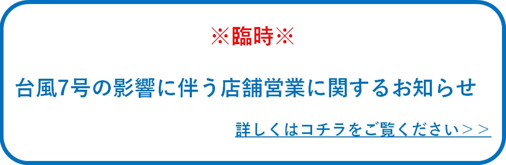台風7号の接近に伴う店舗営業に関するお知らせ 2023 8/13 お知らせ 2023/08/13 台風7号の接近に伴い、一部店舗の臨時休業および営業時間短縮をさせて頂いている店舗がございます。 詳しくはこちらのバナーをクリックしてご確認ください。 情報は変更になる場合がございます。随時更新いたしますので、ご確認頂きますようお願いいたします。 お知らせ 【臨時休業のお知らせ】8月14日(月)・15日(火) RECAMPりんくう 9月9日(土)・10日(日)FOOD TRUCK FESTIVAL Vol.4🚚🚛