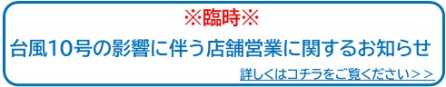 台風10号の接近に伴う店舗営業に関するお知らせ 2024 8/30 お知らせ 2024/08/30 台風10号の接近に伴い、一部店舗の臨時休業および営業時間短縮をさせて頂いている店舗がございます。 詳しくはこちらのバナーをクリックしてご確認ください。 情報は変更になる場合がございます。随時更新いたしますので、ご確認頂きますようお願いいたします。 お知らせ 8月24日(土)イベントに伴うスケートパーク・バスケットコート貸切のお知らせ 【臨時休業のお知らせ】9月4日(水) 魔法のパンケーキ