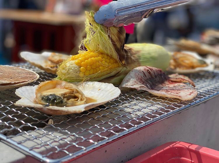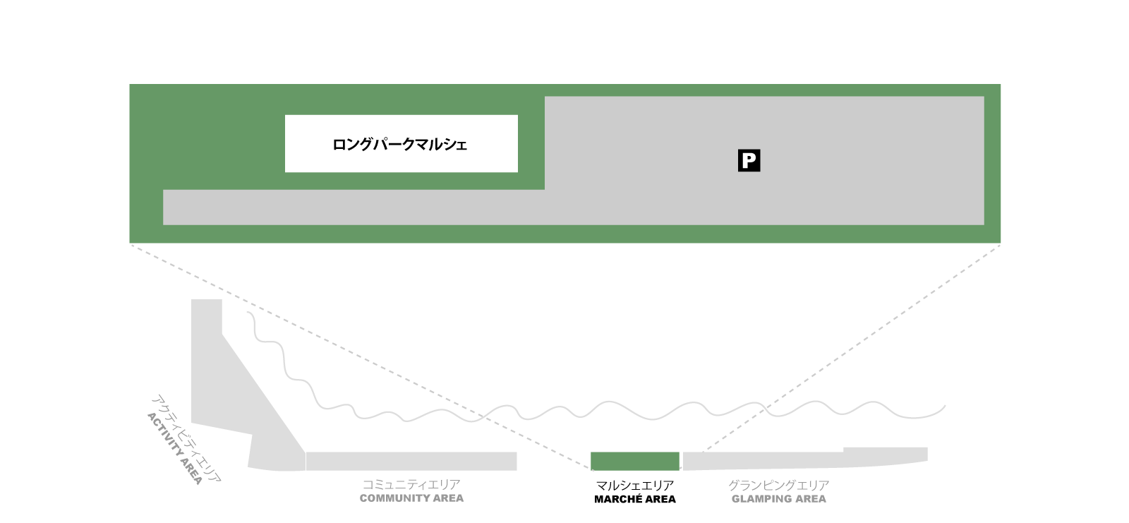 鮮魚棟、テントブース、キッチンカー、バーベキューコーナーなど、公園内の新しいマルシェです。