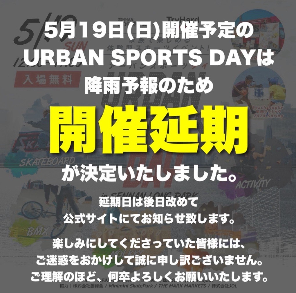 5月19日(日)にURBAN SPORTS DAYは残念ながら悪天候が予想される為、開催を延期と致します。 延期日について後日改めてお知らせいたします。 楽しみにして下さっていた皆... -