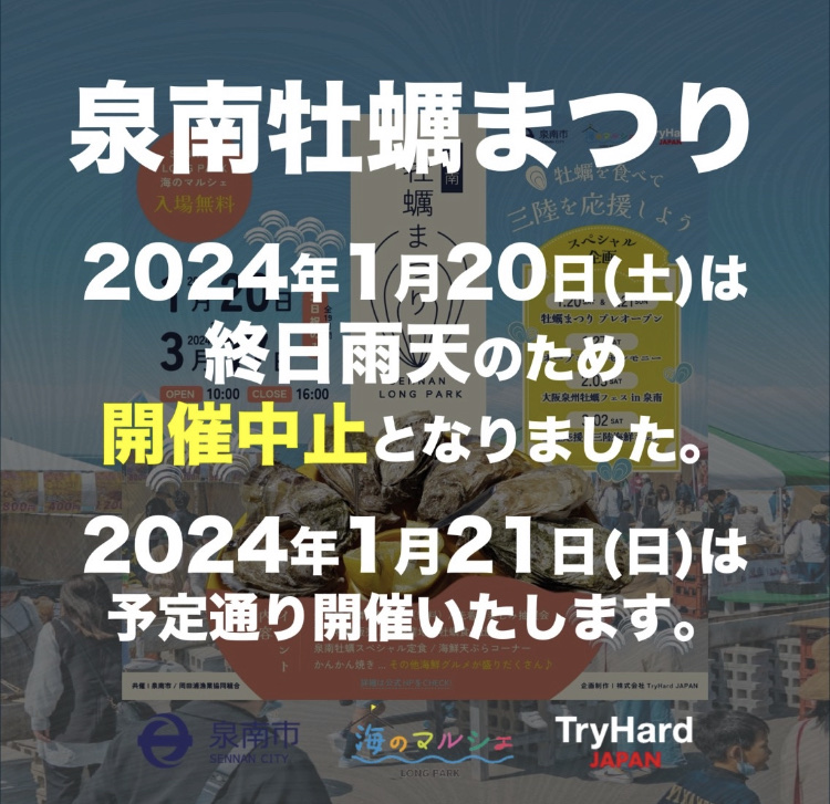 1月20日(土)に開催を予定しておりました 泉南牡蠣まつり は 残念ながら悪天候が予想されるため中止となりました。 1月21日(日)は 予定通り開催いたします。 是非ともご...