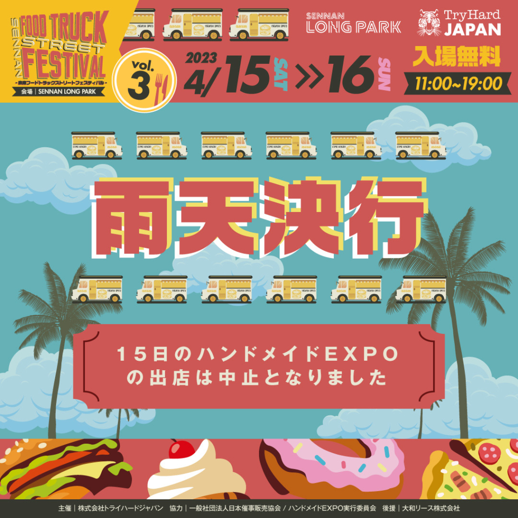 本日開催のSENNAN FOOD TRUCK FESTIVALVol.3ですが、4月15日(土)のハンドメイドEXPOの出店は中止となりました。 楽しみにして下さっていた皆様には誠に申し訳ございませ... -