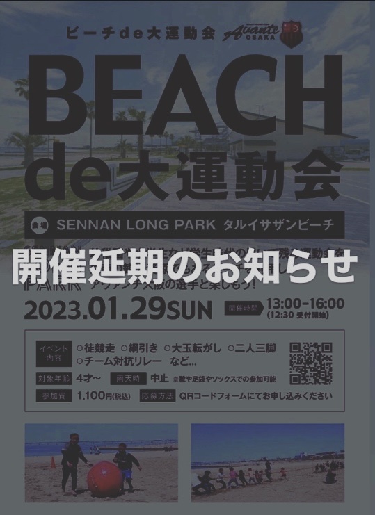 1月29日(日)に開催を予定しておりましたBEACH de 大運動会は 残念ながら悪天候が予想されるため延期となりました。 延期日は現在調整中です。日程が決まり次第お知ら... -