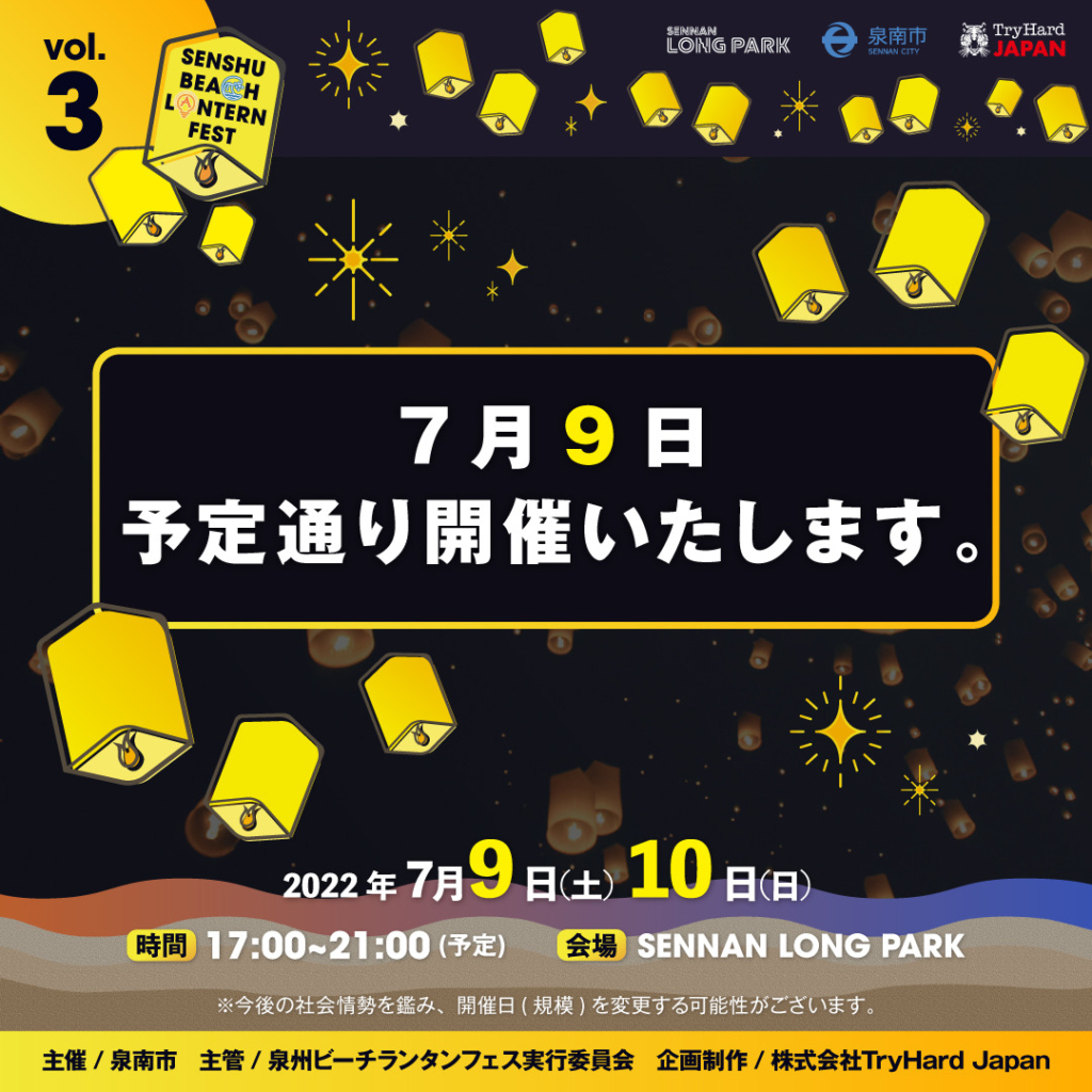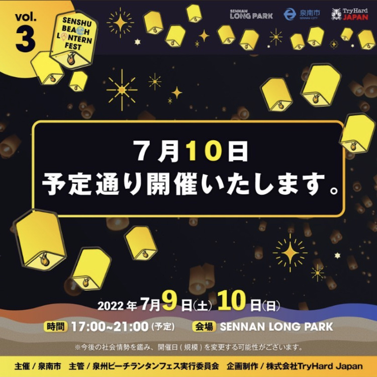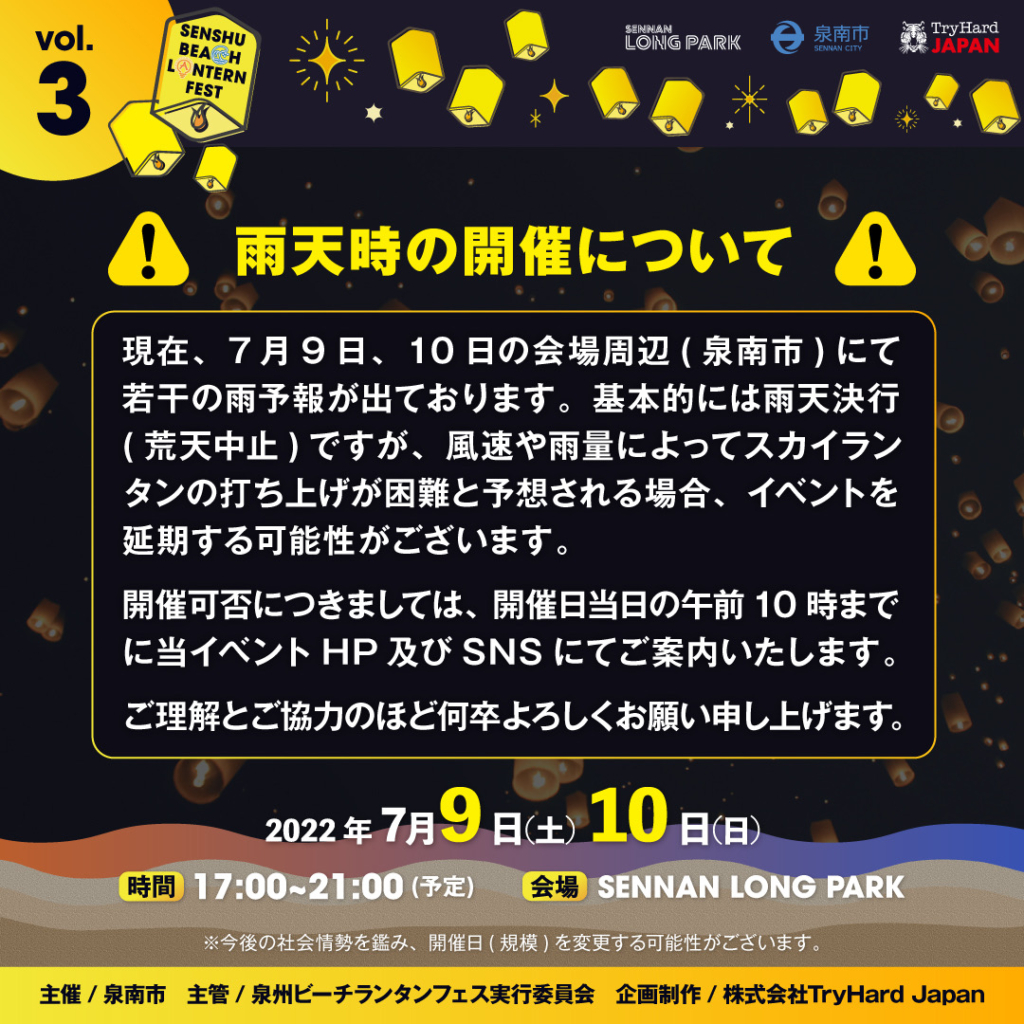 雨天時のご案内 泉州ビーチランタンフェスVol.3の雨天時の開催についてのご案内になります。 開催の可否につきましては、当日の午前10時までにホームページ・SNSにてご... -