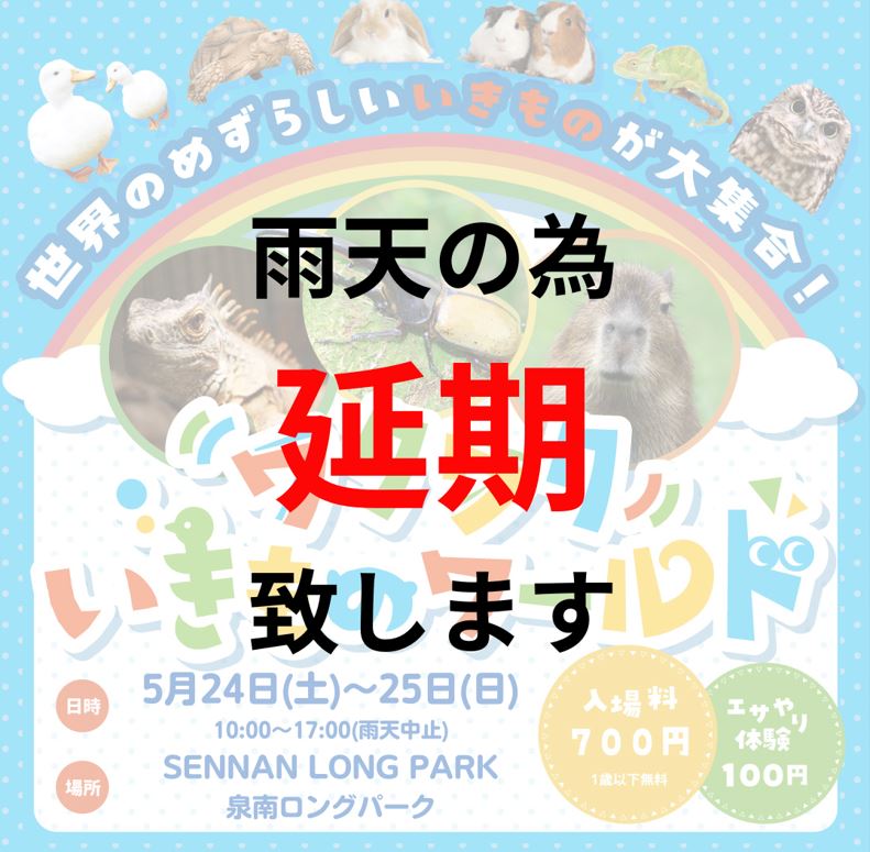 5月24日(土)、25日(日)に開催を予定しておりました クワクいきものワールド は 残念ながら雨天予報の為開催延期となりました。 次回開催日程は6月7日(土)、8日(日)とな...