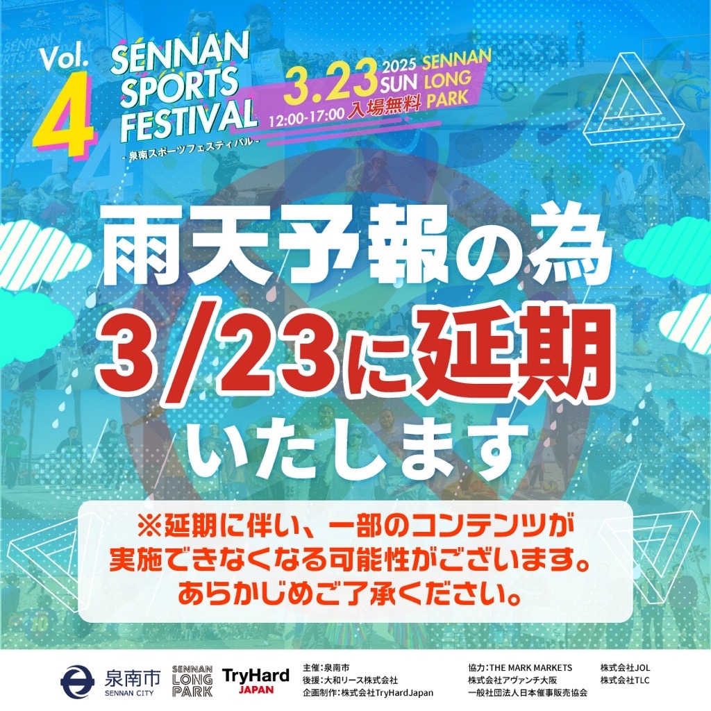 3月16日(日)SENNAN SPORTS FESTIVAL Vol.4は残念ながら雨天予報の為、開催を延期といたします。 3月23日(日)に開催致します。 楽しみにして下さった皆様には誠に申し訳...