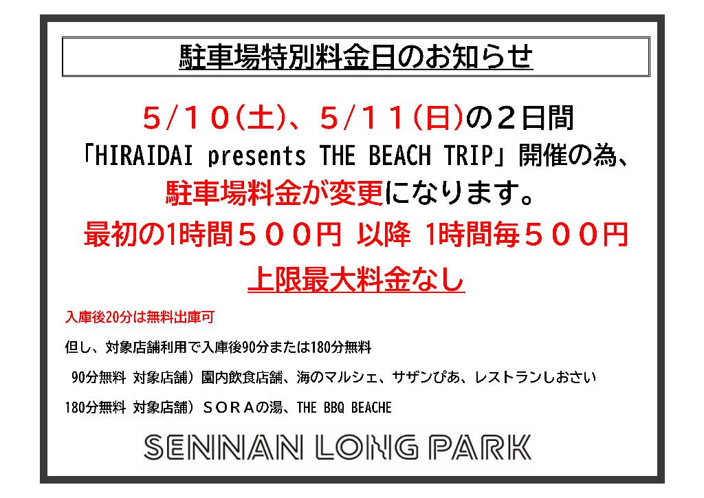 イベント開催に伴いまして駐車料金が変更になります 5月10日(土)、5月11日(日) HIRAIDAI presents THE BEACH TRIP・THE SOLO TRIP ≪料金変更≫最初の1時間500円 以降 1... -