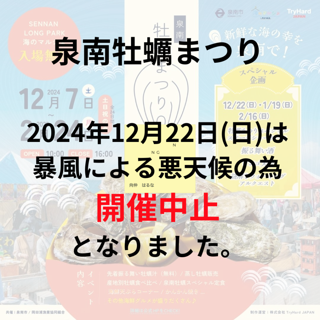 12月20日(日)に開催を予定しておりました 泉南牡蠣まつり は 残念ながら暴風による悪天候の為開催中止となりました。 次回スペシャル企画の日程は2025年1月19日(日)とな... -