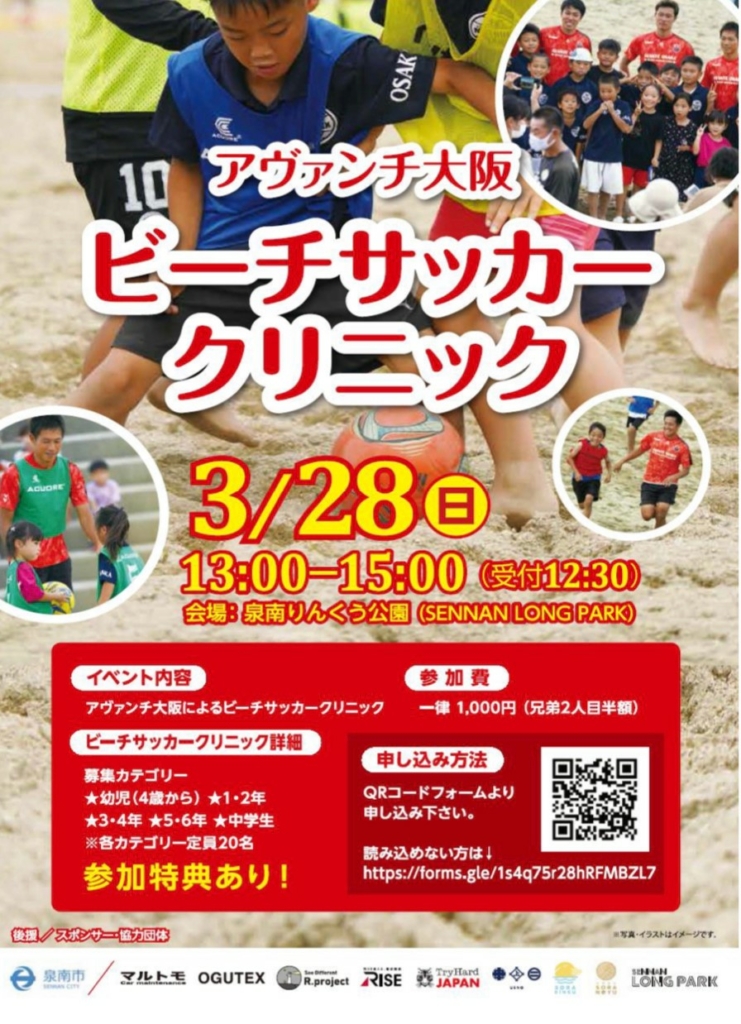 アヴァンチ大阪「ビーチサッカークリニック」開催‼ ★日時:3月28日(日) ★時間:13:00~15:00(受付12:30~) ★参加費:1,000円 兄弟2人半額 ★カテゴリー 幼児...