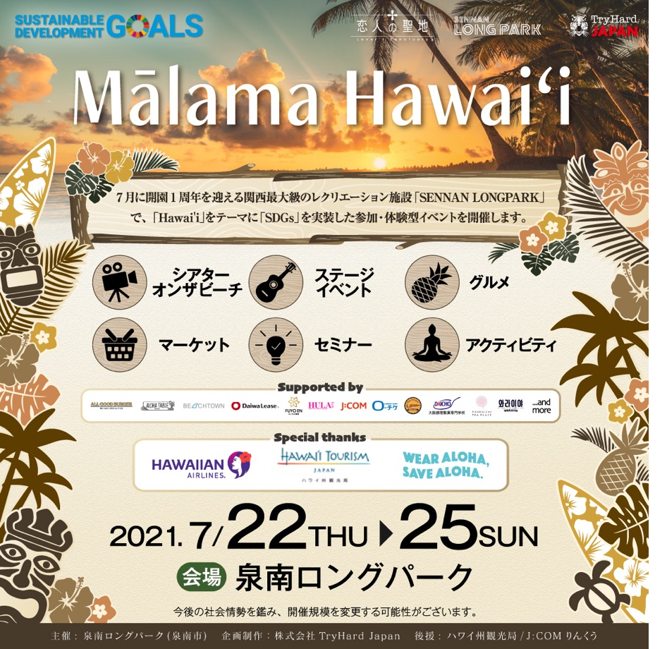 SENNNAN LONG PARKでHawaii気分を体験しませんか? 日時:7月22日(木・祝)~7月25日(日) 時間:15:00~21:00 入場料金:①(大人)2,000円/1人 (小中高校生)1,000円/1... -