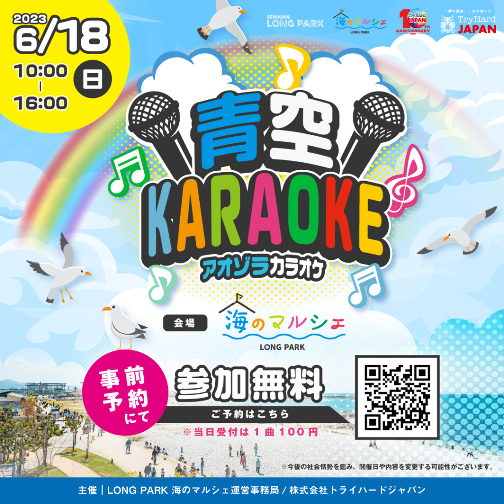 日時:6月18日(日)時間:10:00~16:00場所:SENNAN LONG PARK海のマルシェ料金:参加・観覧無料✨(参加者は事前予約制) 当日受付は1曲100円 SENNAN LONG P... -