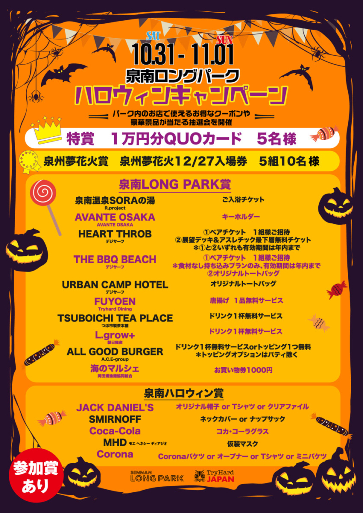 10月31日(土)&11月1日(日)の2日間 パーク内のお店で使えるお得なクーポンや豪華景品が当たる抽選会を開催! 対象者の条件は♪ 仮装でご来園頂いたお客様 ... -