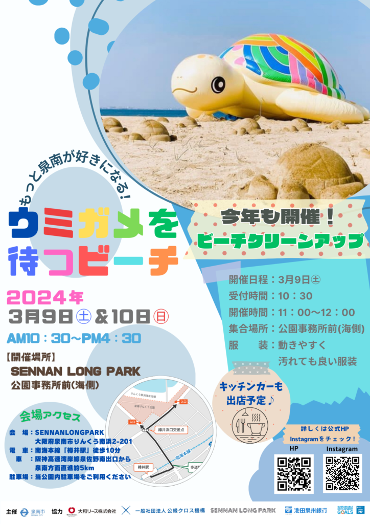 日 時:3月9日(土)、10日(日)時 間:10:30~16:30参加費:無料✨ 今年で3回目となるウミガメを待つビーチ🐢 SENNAN LONG PARKに隣接するタルイサザン... -