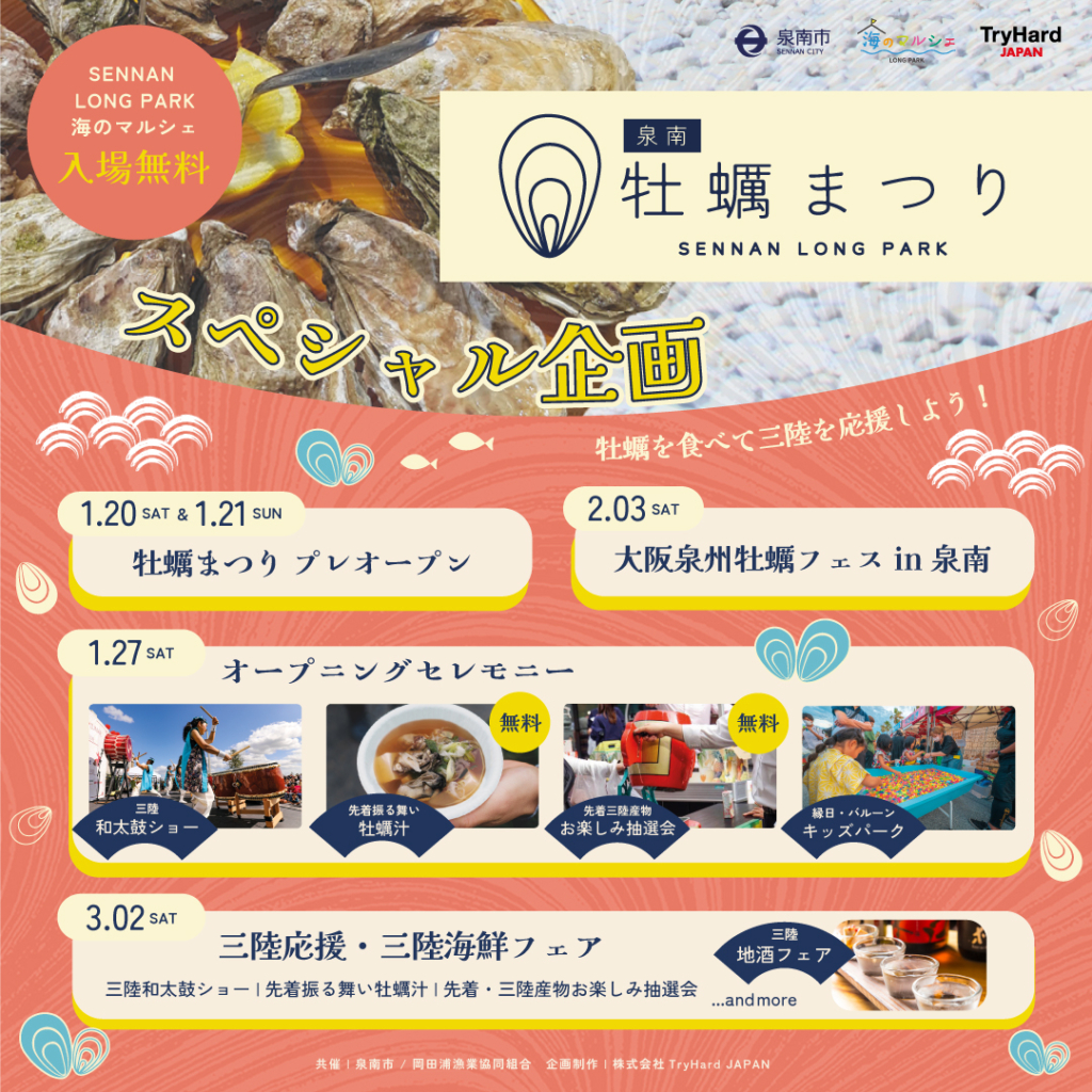 スペシャルイベントは、先着順「振る舞い牡蠣汁」の無料提供や、三陸の特産物が当たる「お楽しみ抽選会」、
