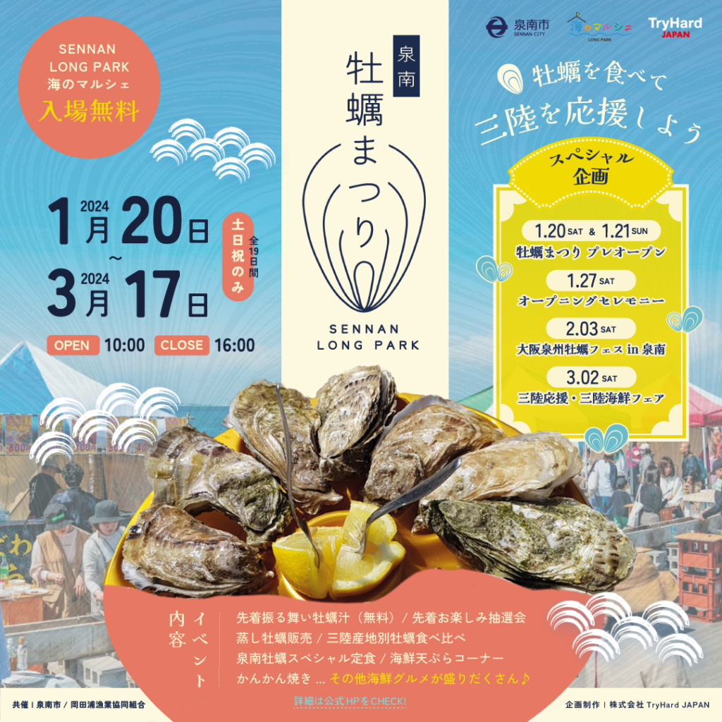 この冬SENNAN LONG PARKの海のマルシェエリアにて、泉南牡蠣まつりが開催されます🤗