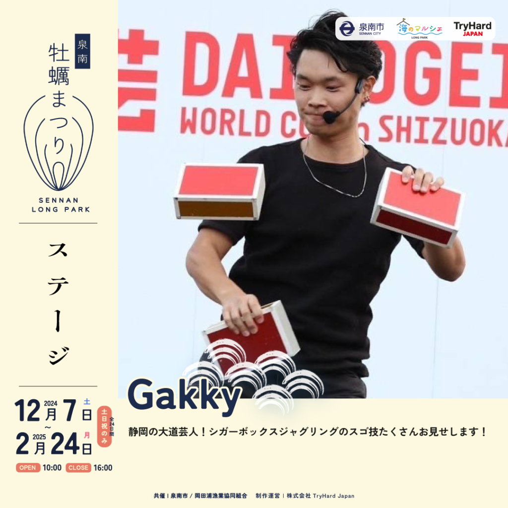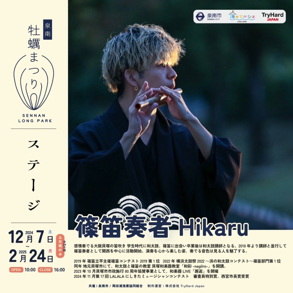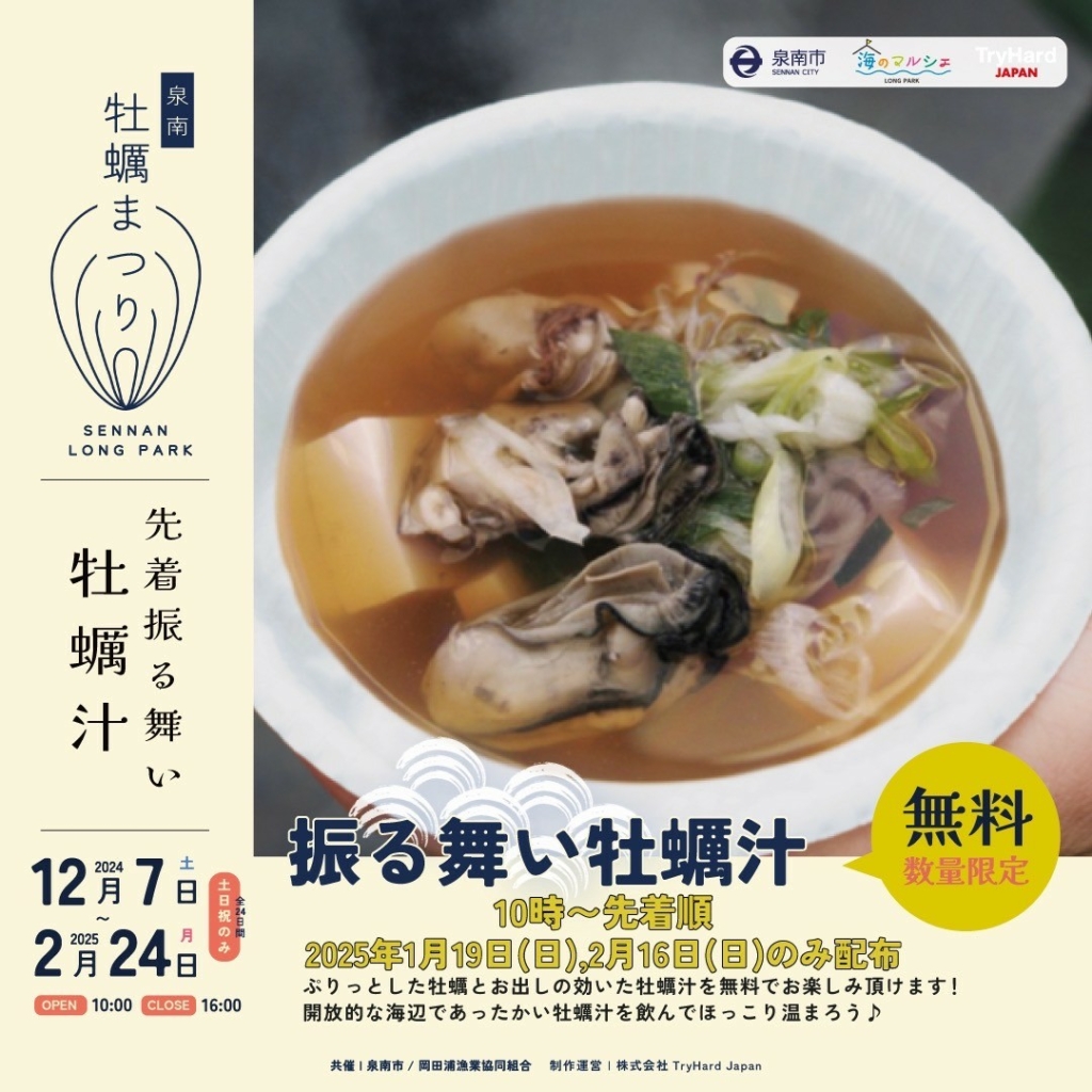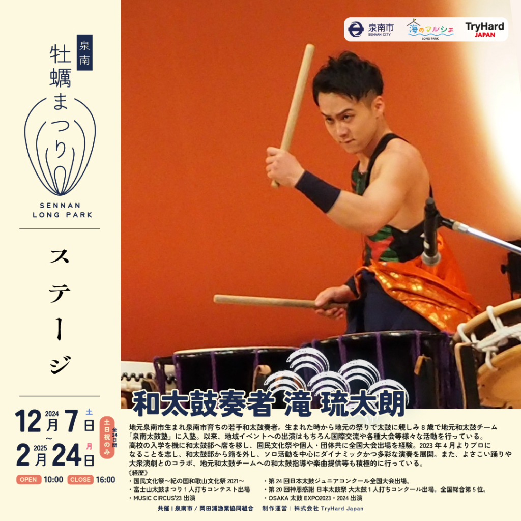 この日は数量限定で振る舞い牡蠣汁やステージでは泉南市出身の滝 琉太朗さんによる迫力のある和太鼓の演奏や