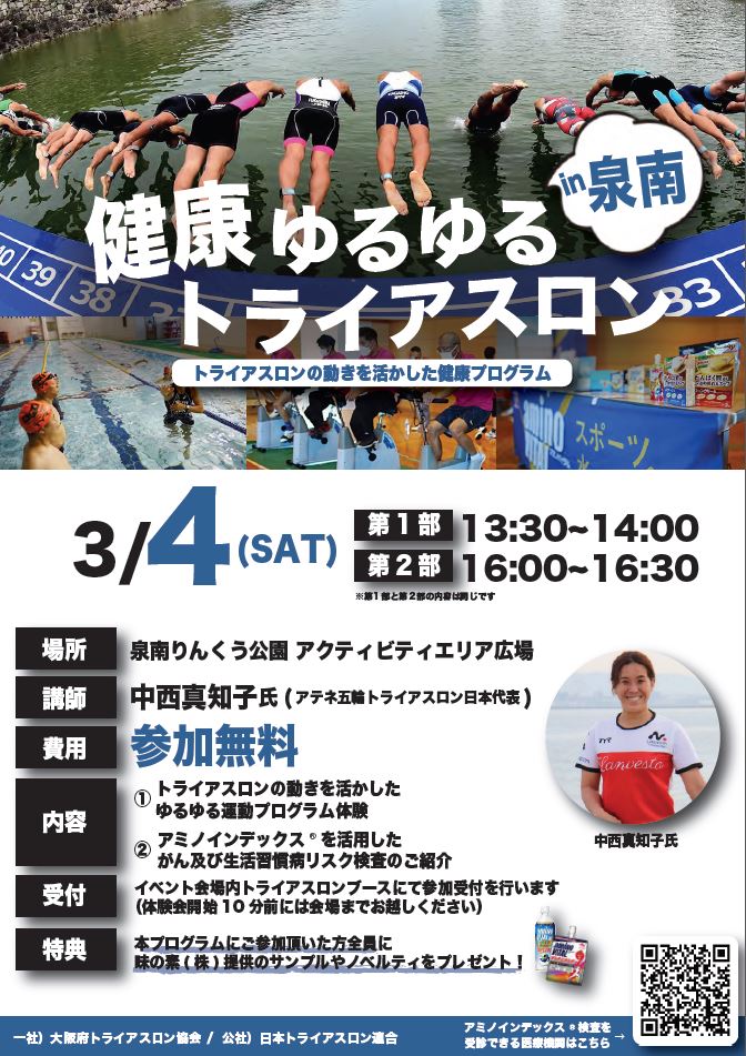 内容はトライアスロンの動きを活かしたゆるゆる運動プログラム体験やアミノインデックスを活用した