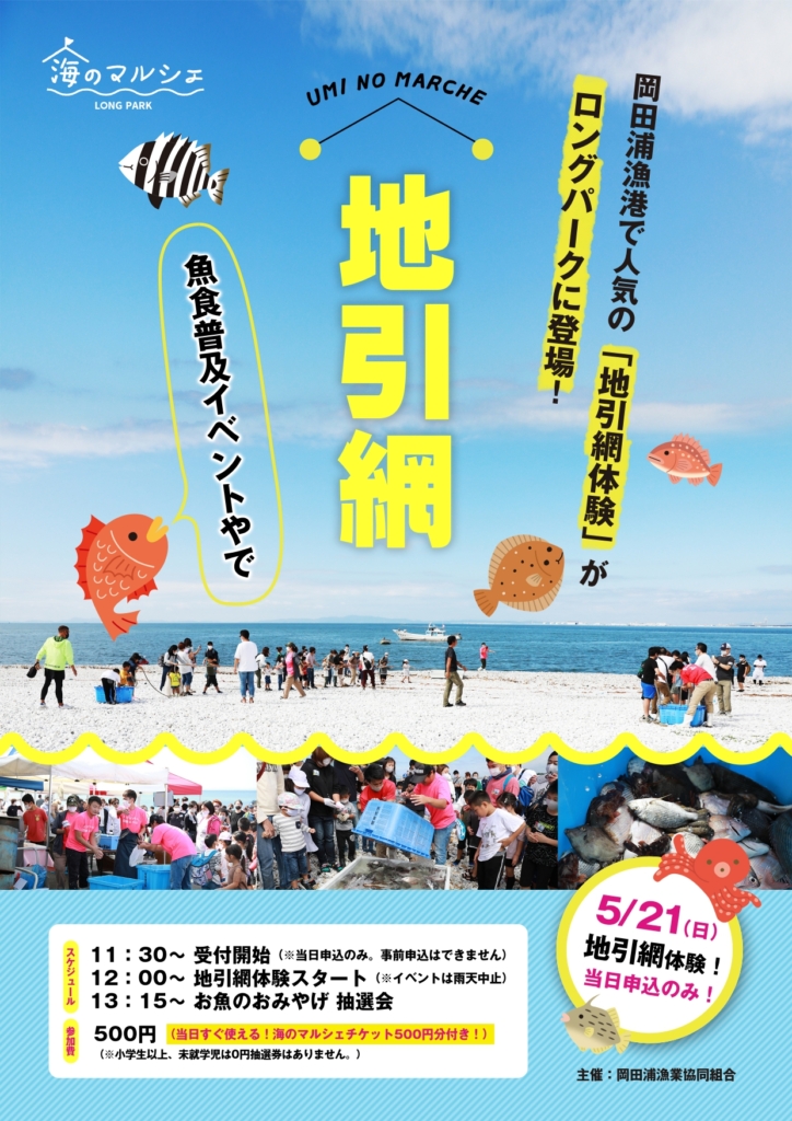日時:5月21日(日)時間:11:30(受付開始)~参加費:500円(※小学生以上、未就学児は0円抽選権券はございません) SENNAN LONG PARK海のマルシェにて地引網体験開催します...