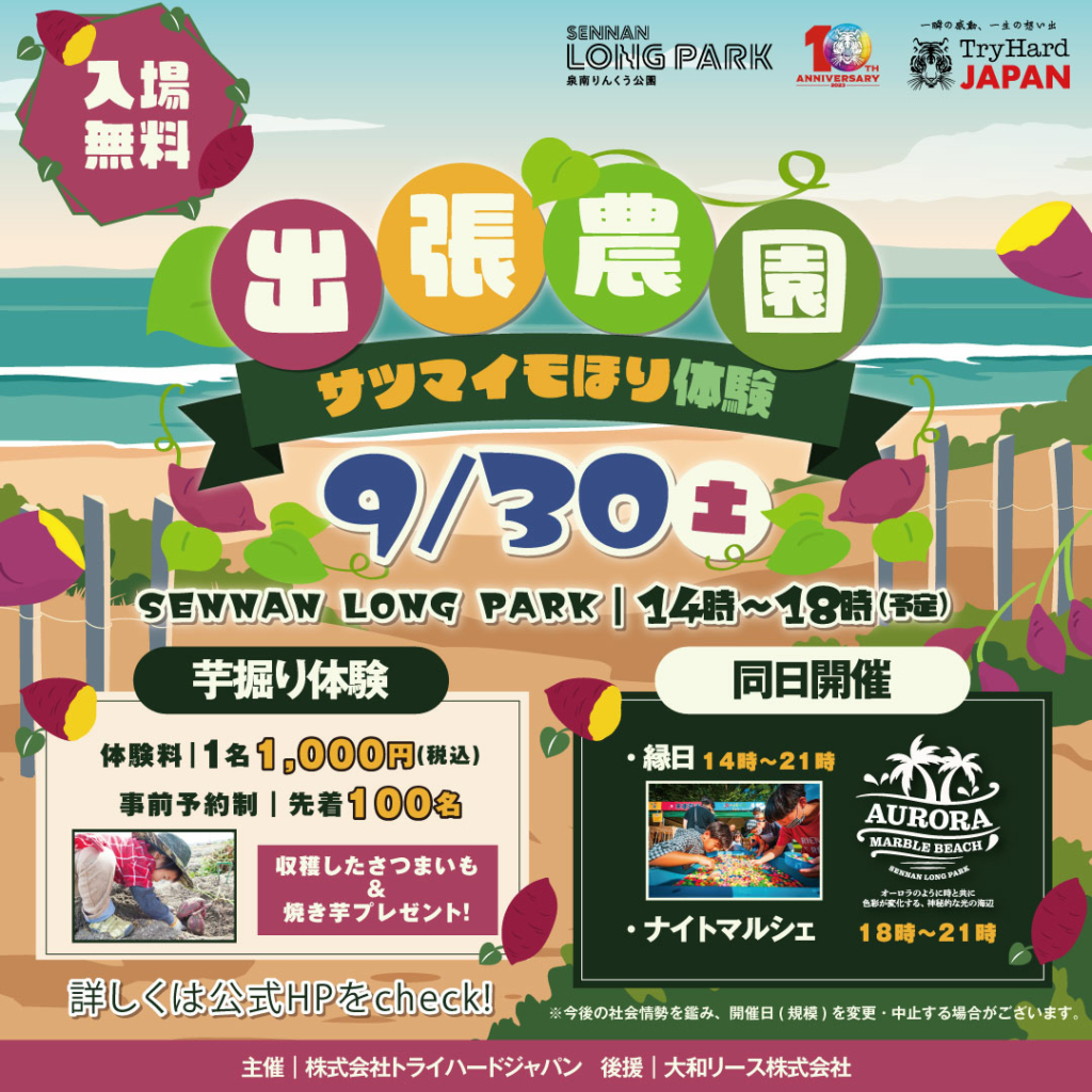 日 時:9月30日(土)時 間:14:00~18:00場 所:海のマルシェエリア体験料:1名1,000円(税込)事前予約制:先着100名様 SENNAN LONG PARKで秋の味覚の収穫体験をして... -